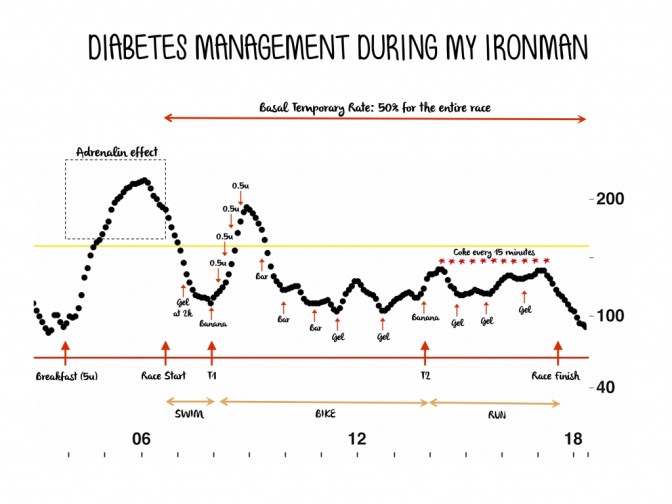I will start with what I ended up using to complete Ironman Wales. It took me 15 hours to complete. My blood glucose stayed in range throughout the 1 hour 20 minute swim and 7 hour 35 minute bike ride. It went low during the run which tends to happens on my half Ironman distances too.